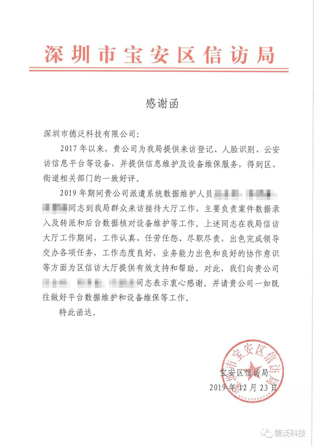 近期,德泛科技陸續(xù)收到了來自深圳市信訪局、深圳市退役軍人事務(wù)局等職能部門的表揚信(感謝函)。深圳市信訪局的表揚信講到:“德泛科技在云安訪信息平臺項目中出色的完成了領(lǐng)導(dǎo)交辦的各項任務(wù),得到了領(lǐng)導(dǎo)的充分肯定與來訪群眾的一致好評?!?/p>